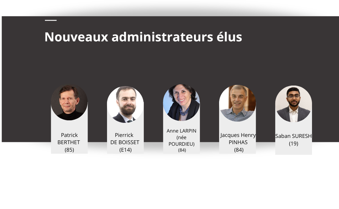 Félicitations aux nouveaux administrateurs élus ou réélus : Anne LARPIN (84), Pierrick de BOISSET (E14), Patrick BERTHET (85), Jacques Henry PINHAS (84) et Saban SURESH (19).